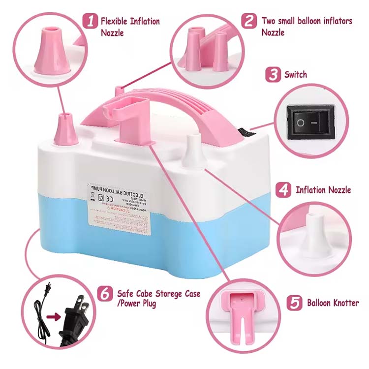 डुअल-आउटलेट डिजाइन डिजाइन समर्थन गर्दछ, र एक शक्तिशाली मोटर साथ, यसले 10 सेकेन्डमा मानक 12-इन्च बेलुनको मुद्रास्फीति पूरा गर्न सक्दछ, जुन ठूलो मात्रामा आवश्यकताहरू जस्तै उपयुक्त छ।