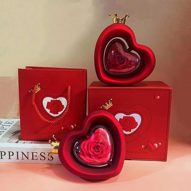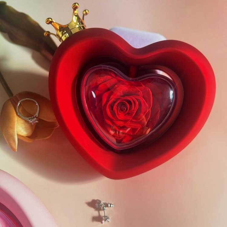 हार्ट शेप रोज ज्वेलरी बक्समा ए ग्रेडको संरक्षित फूलहरू प्रयोग गरिन्छ, जसको रङ र बनावट ताजा फूलहरूबाट फरक गर्न सकिँदैन।