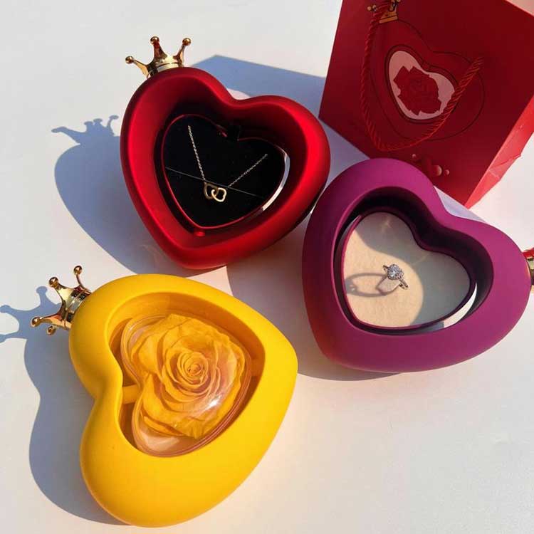हार्ट शेप रोज ज्वेलरी बक्स, मुटुको आकारले प्रेमको प्रतीक हो। यसले सदाको लागि पोषित हुनुको अर्थलाई जोड्छ।