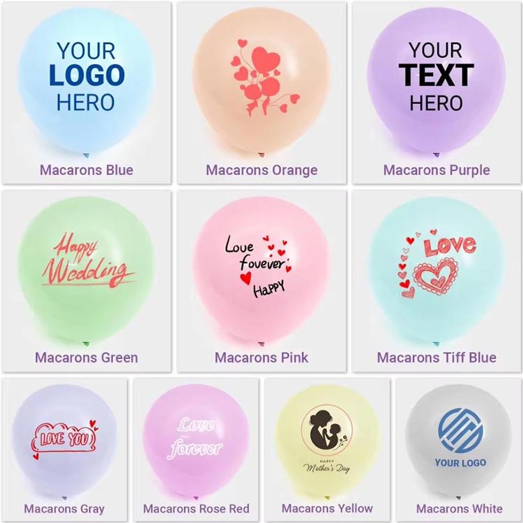 आफ्नो ब्रान्ड पहिचान अद्वितीय बनाउनुहोस्। हाम्रो उन्नत प्रिन्टेड लेटेक्स बेलुन टेक्नोलोजीले तपाईंको लोगो वा डिजाइनका लागि रङ प्रतिबन्धहरू हटाएर छवटा रङहरूसम्म समर्थन गर्दछ। चाहे त्यो ढाँचा होस् वा जटिल ग्राफिक्स, हामी तपाईंलाई यो डेलिभर गर्न सक्छौं। हामी एकल-पक्षीय, डबल-पक्षीय, र पाँच-पक्षीय मुद्रण प्रस्ताव गर्दछौं। तपाईं आफ्नो आवश्यकता अनुरूप आफ्नो लोगो चयन गर्न सक्नुहुन्छ।