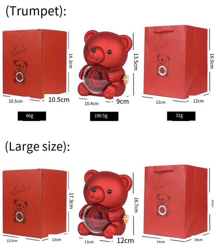 संरक्षित फूल सरप्राइज हग भालु दुई आकारमा आउँछ: ठूलो र सानो। तपाईं आफ्नो आवश्यकता अनुसार मनपर्ने आकार चयन गर्न सक्नुहुन्छ! ध्यान दिनु पर्ने एउटा कुरा के हो भने तस्विरमा रहेको नेकलेस र औंठी तस्विर खिच्नका लागि प्रोप्स हो।दुई साइजको आ-आफ्नै विशेषताहरू छन्, जसले प्रत्येक भावनालाई सही तरिकाले बोक्न अनुमति दिन्छ।