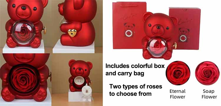 साबुनको फूलबाट फरक ।हाम्रो संरक्षित फूल सरप्राइज हग बियरहरू ताजा वास्तविक फूलहरूबाट बनेका हुन्छन् जसले निर्जलीकरण, रङ संरक्षण र आकार दिने लगायतका विशेष प्रक्रियाहरूबाट गुज्रिन्छन्। यी फूलहरूले वास्तविक फूलहरूको पूर्णता र आकार कायम राख्छन्, तिनीहरूलाई लामो समयसम्म रहन अनुमति दिँदै! सामान्यतया, तिनीहरू 3-5 वर्ष टिक्न सक्छन्! कुनै पानी आवश्यक छैन! तिनीहरू जीवन्त र जीवन्त रहन्छन्! यो विचारशील उपहार सधैंभरि रहन दिनुहोस्!