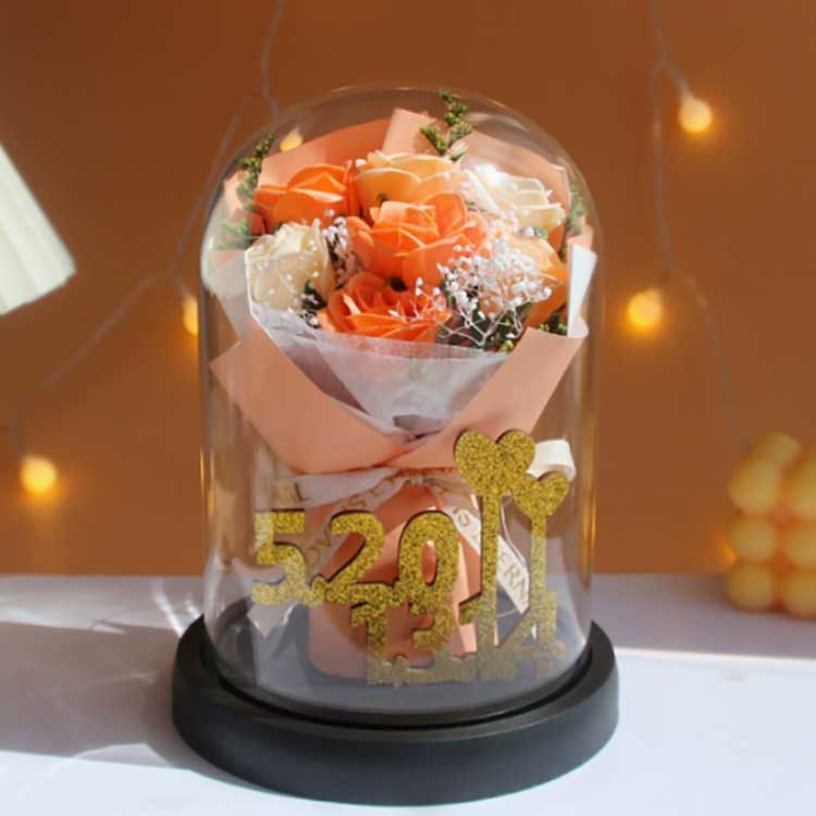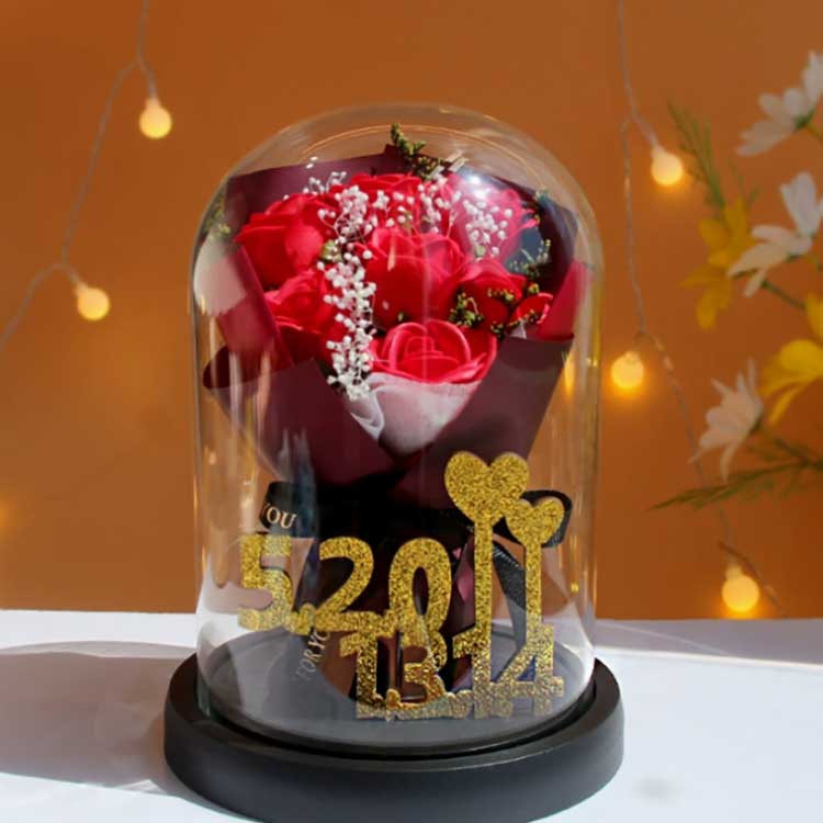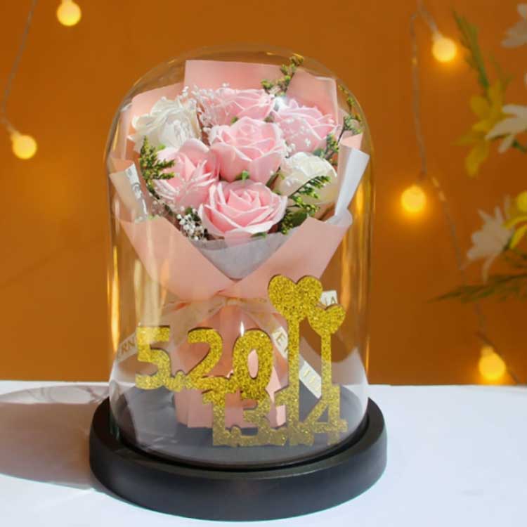 यो गिलास गुलाबको गुच्छा फूलहरूलाई ओइलाउनबाट रोक्नको लागि डिजाइन गरिएको हो, र भित्रका गुलाबहरू ओइलाउने छैनन्। गुलदस्ता धेरै जीवन्त छ, वास्तविक फूलहरूबाट लगभग चिन्ने योग्य छ, र यसले गुलदस्ताको सुन्दरतालाई राम्रोसँग प्रस्तुत गर्न सक्छ। भित्र, सुनौलो अंक 520+1314 ले 520 र 1314 नम्बरहरूलाई प्रतिनिधित्व गर्दछ, प्रेमको प्रतीक र यस उपहारको विचारशीलतालाई हाइलाइट गर्दछ।